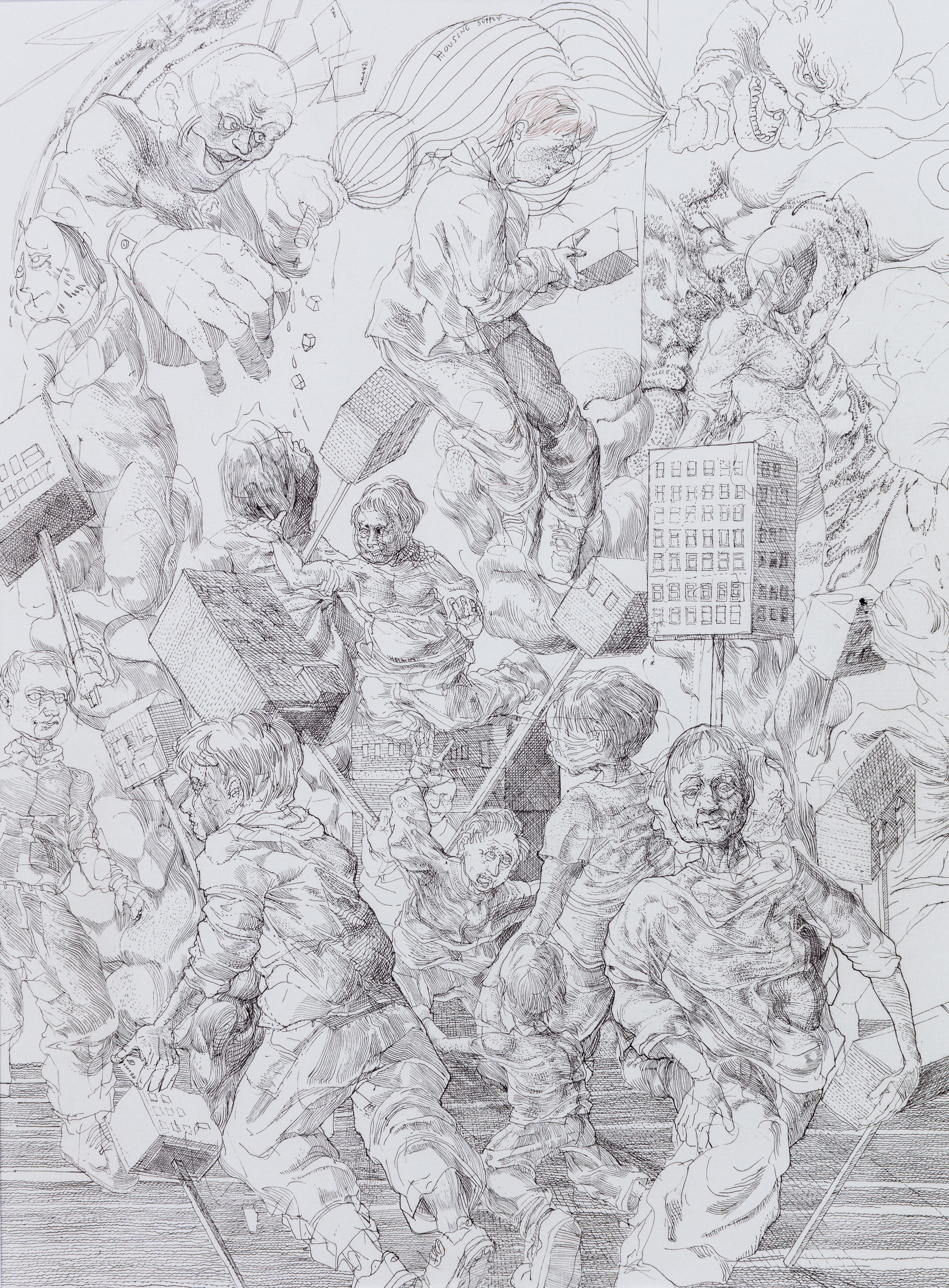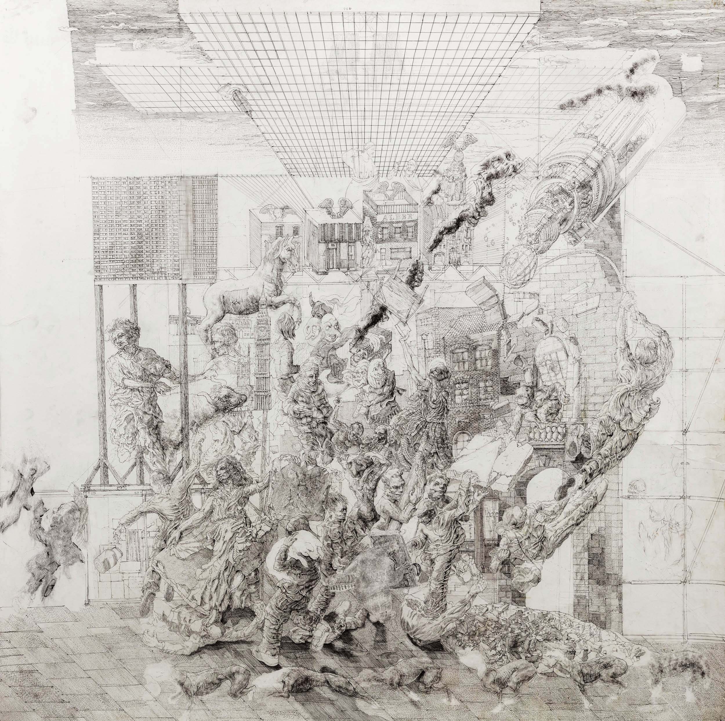Millions of interactions happen daily in the Square Mile, a small space with enormous annual economic output, amounting to a quarter of England’s GDP. In the city of London, all socioeconomic systems connect through competition; you will see the competition on the shop floor and the trading floor, from the retail bank to the Bank of England, the public houses and the pension funds, the insurance brokers, and the shadow banks. But  Fights typically happen bureaucratically and, as such, are rarely represented. But I wanted to ask how we could visualise the complex web of ‘invisible hands’? The city prides itself on competition, so I decided to create a drawing showing a melee eruption in the streets between Liverpool Street and Bank Station,  and the competition in the city of London's financial sector.
